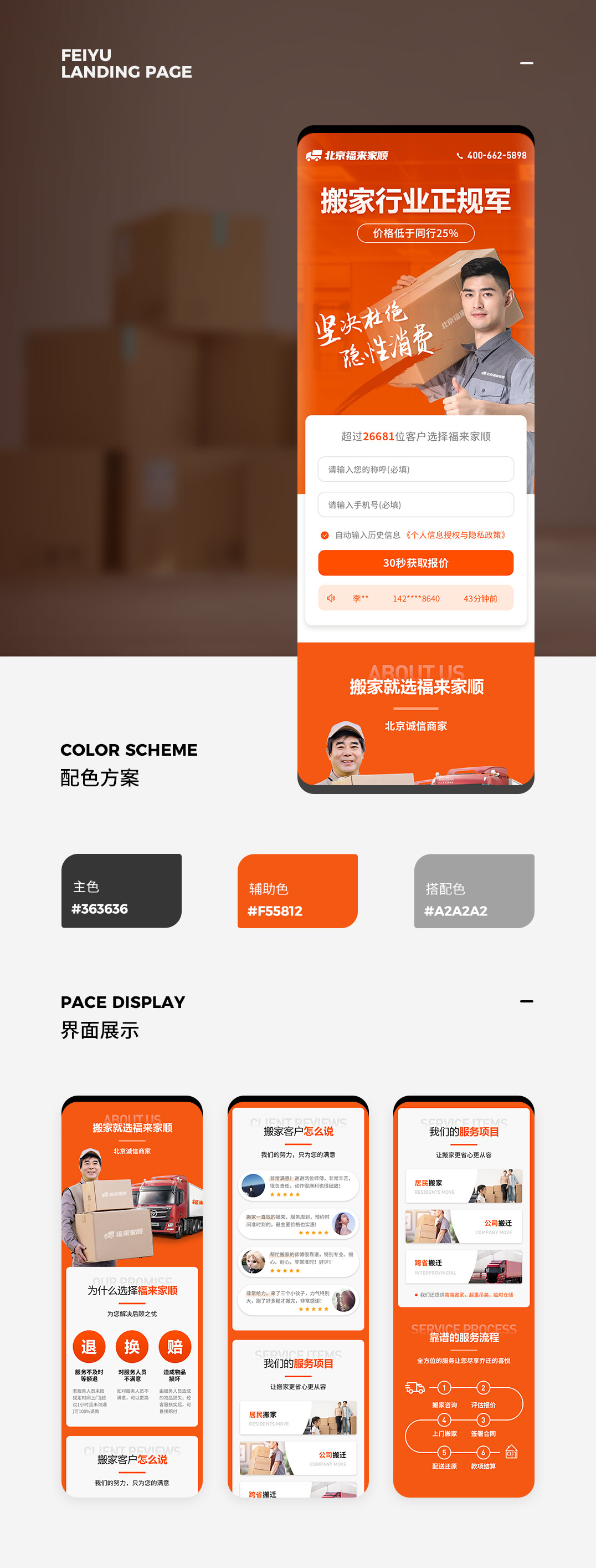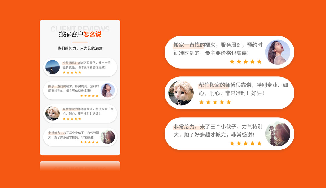 除了公司形象的宣传外,为了再次提升用户信任感,我们还从微信里采集了福来家顺的历史客户评价用100%的五星真实好评来打消访客的所有顾虑