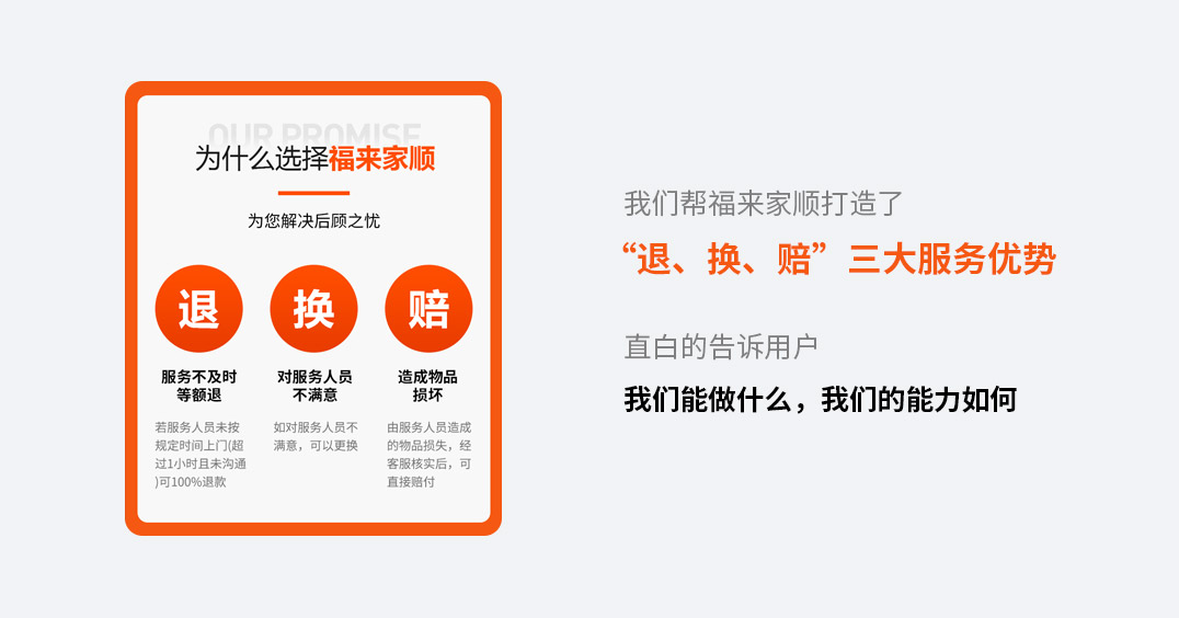 我们帮福来家顺打造了“退、换、赔”三大服务优势,直白的告诉用户我们能做什么,我们的能力如何