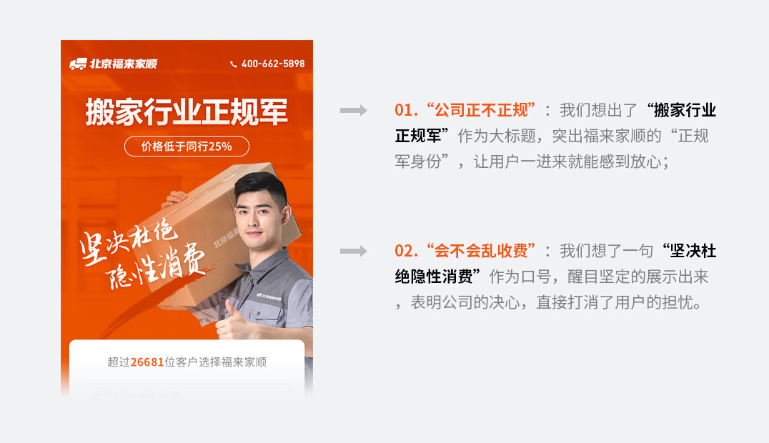 搬家行业素来竞争激烈,特别是在北京这样的一线城市。经过我们调研,发现在搬家行业中各个公司规模水平参差不齐,客户往往非常担心遇到不正规,乱加价,乱收费的情况,所以用户最关心的2个问题就是“公司正不正规”“会不会乱收费”