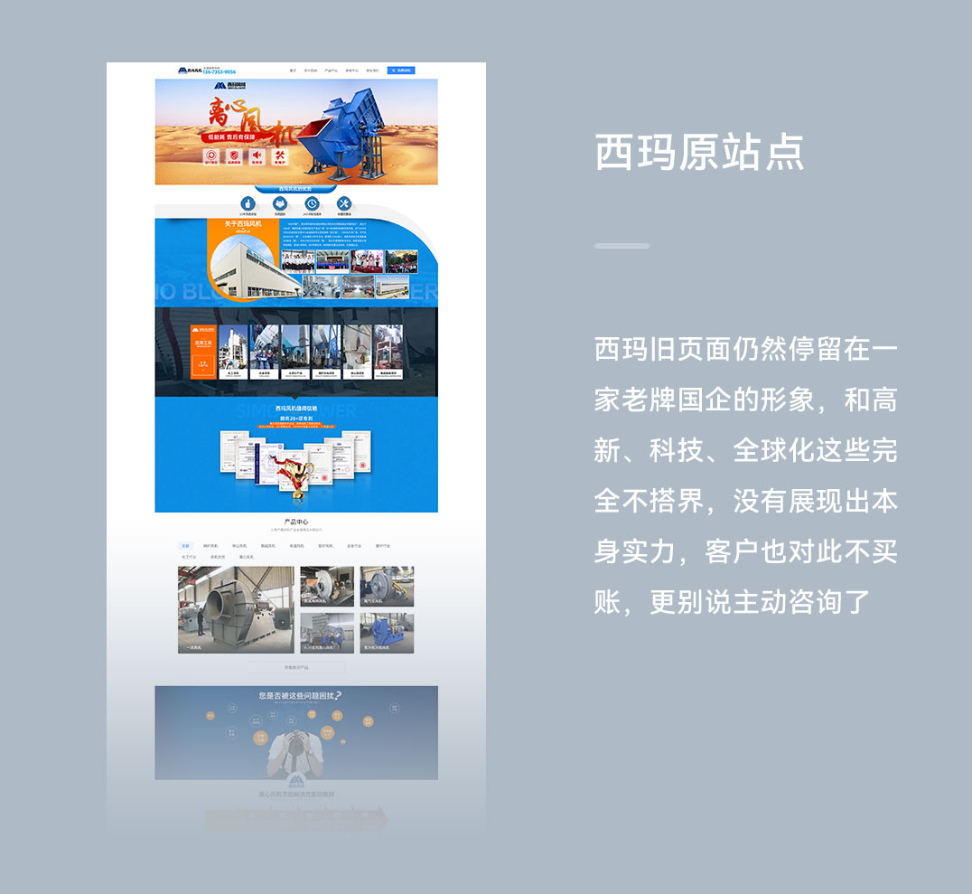 西玛作为一个拥有核心技术的实力派企业,其线上页面仍然停留在一家老牌国企的形象,和高新、科技、全球化这些完全不搭界,没有展现出本身实力,客户也对此不买账,更别说主动咨询了。
