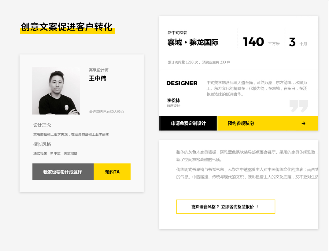 比如, 设计师部分对应“我想了解这个设计师,预约TA”,案例部分对应着“预约参观私宅”,案例详情页的尾部也预留 ”喜欢这套风格?立即咨询整装报价!”等等,每一个都是站在用户的视角,而不是冰冷生硬的催促客户留言预约。