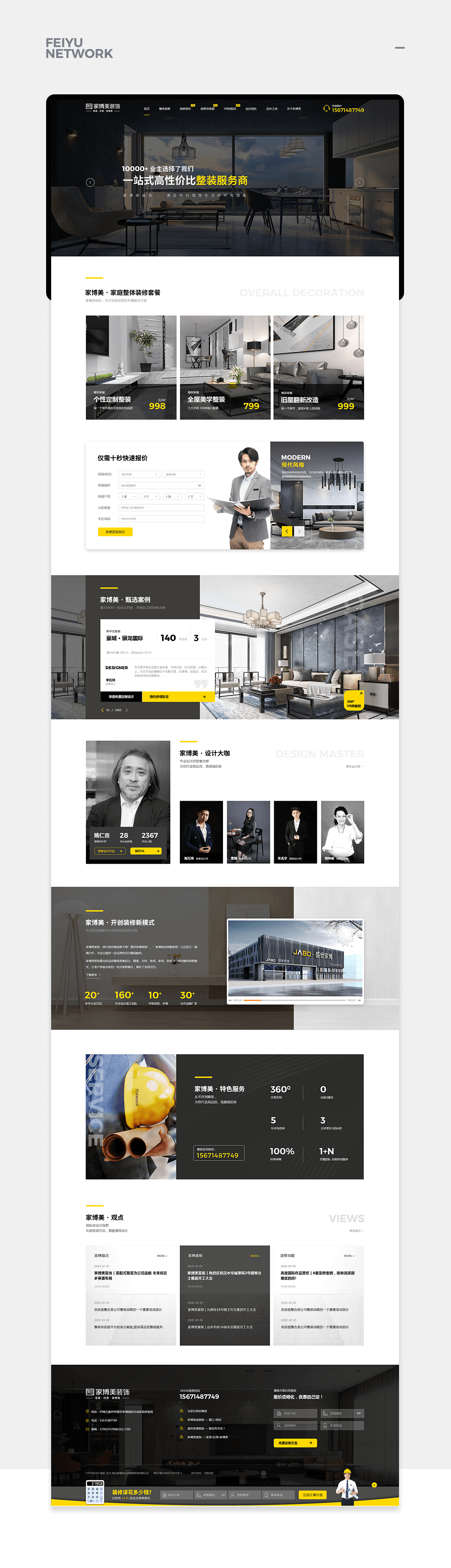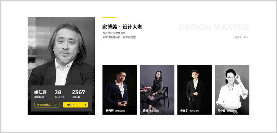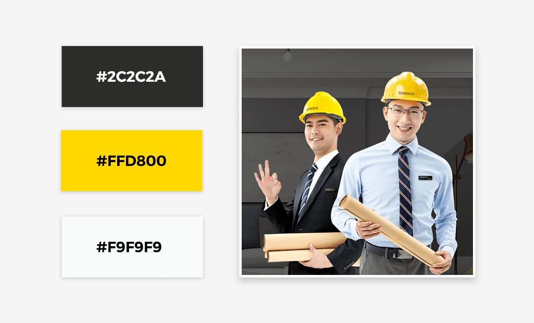 建筑装饰行业带给我们的整体硬朗厚重的感觉,色彩上也多选用能带来 稳固、安全感受的颜色。但是做为设计行业,时尚和前卫也是不可缺少的部分,所以网站的主体颜色上选择了黑色系做为主色,其中间或点缀以亮黄色,让整个网站给人的感觉是含蓄内敛,蕴藉隽永,但是跳跃着年轻时尚的活力。