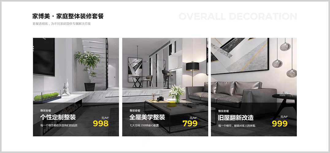 于是我们在首页最醒目的地方,放上了家博的三大套餐报价。让客户第一眼看到后,能更直观的估算出自家房屋的装修费用,真正做到了套餐透明化。