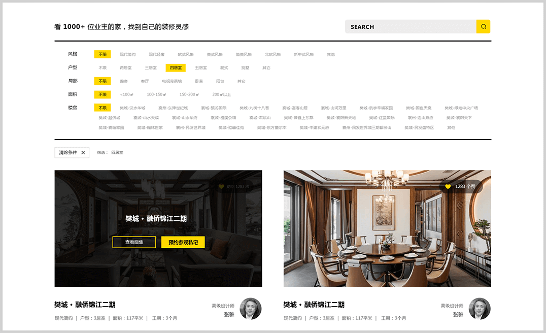 比如,我们将案例拆分细化。每个案例划分到小区,按面积、户型的不同可以很快让用户找到自己相同的户型,在观看案例的时候,将案例效果图代入到自己房子的场景,增强了用户对网站的认同感。也完美的映证了我们的广告词“看1000+位业务的家,找到自己的装修灵感”。