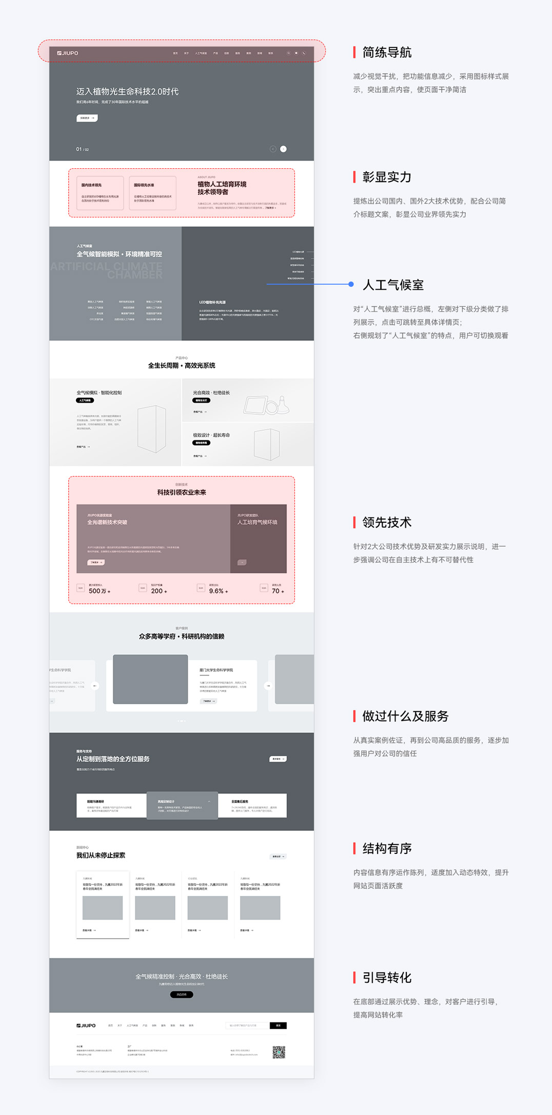 那么如何帮助JIUPU官网即区别于同行,又能很好的展现自身实力?经过分析思考,我们决定从视觉、文案、内容这三个方面来进行网站差异化。