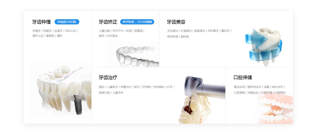 医疗同类型网站的服务项目展示都较为混乱,无法清晰直观的让访客一目了然。我们的做法是:区分开其他竞争对手的网站布局,将产品的类别分为5大块,并且突出主打服务项目。这样访客即可快速根据自己的需求,从而对号入座进行选择,有效提升了客户的访问体验与决策速度。