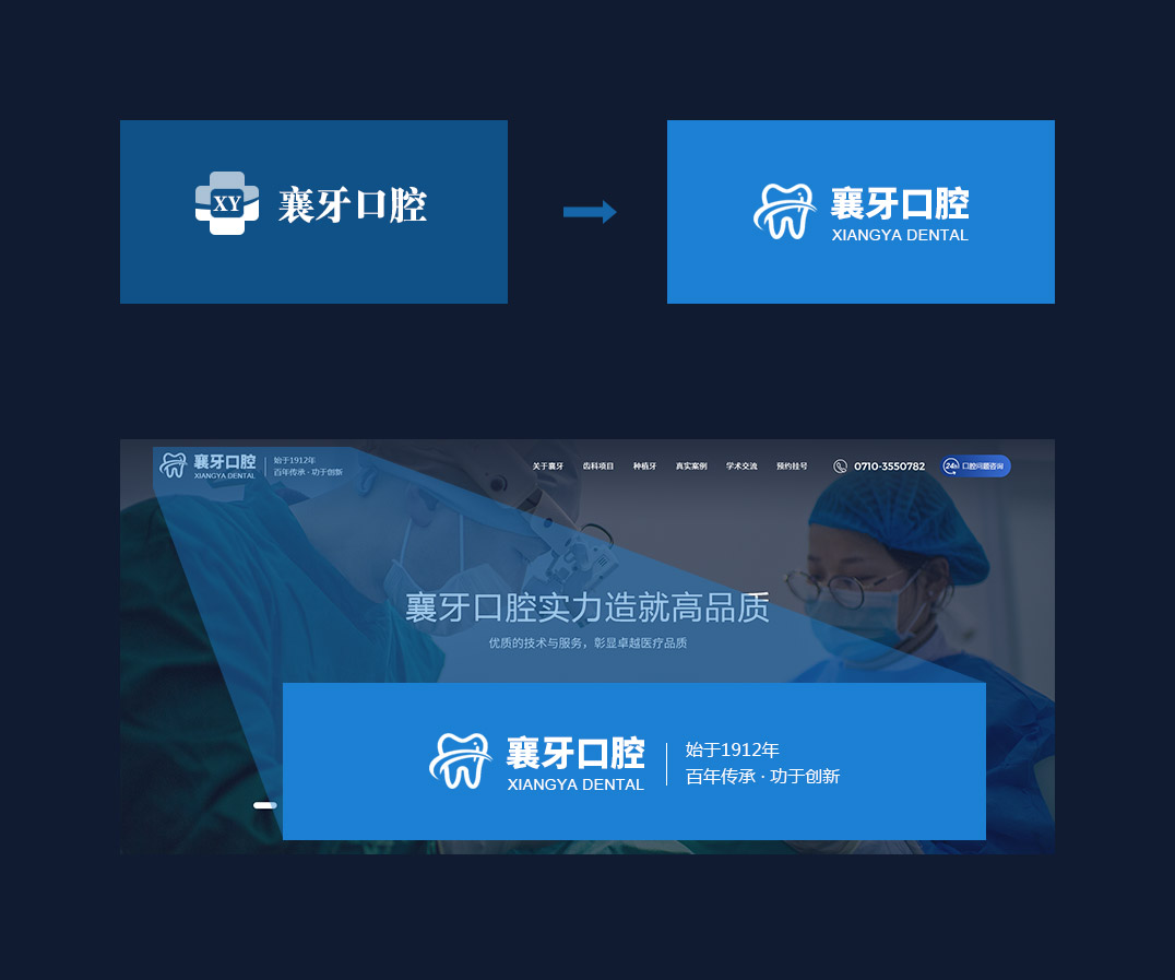 我们重新优化升级了logo,使其更加简洁现代。为了更好了表达襄牙口腔是一家有着百年传承的老店,我们在logo旁放置了一个“始于1912年,百年传承•功于创新”的标语,让访客无论浏览到哪个页面,都可以看到它。